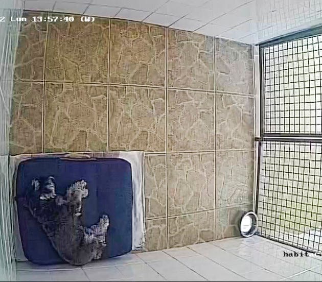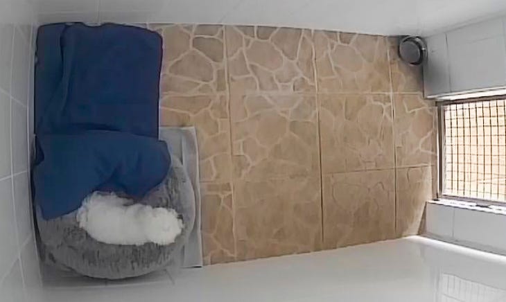 Como ven en las imágenes las habitaciones están alicatadas tanto las paredes como el piso, el piso tiene azulejos antideslizantes y están levemente inclinados para evitar resbalones y encharcamientos (por derrame del agua o algún pipí ) y disponen de una puerta hecha de acero galvanizado con su cerradura de seguridad.