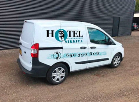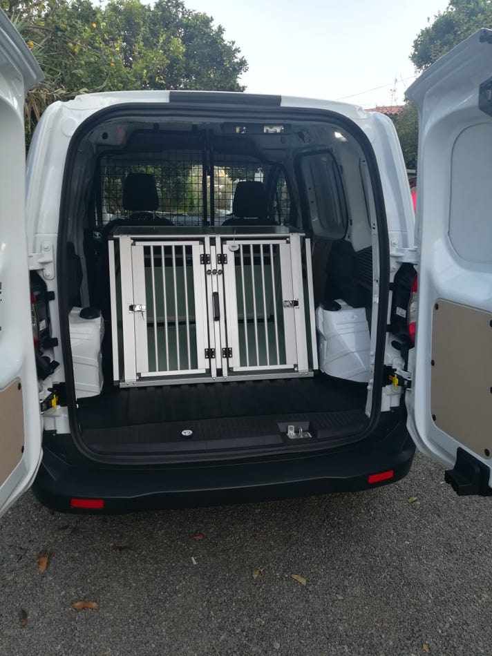 Disponemos de una Ford Transit Courier, preparada con una jaula de transporte de aluminio anclada perfectamente al suelo del vehículo ( puede hacerse doble ) para poder llevar dos perros de distintos clientes, pudiendo llevar un tercero en un transportín rígido en el asiento del acompañante.